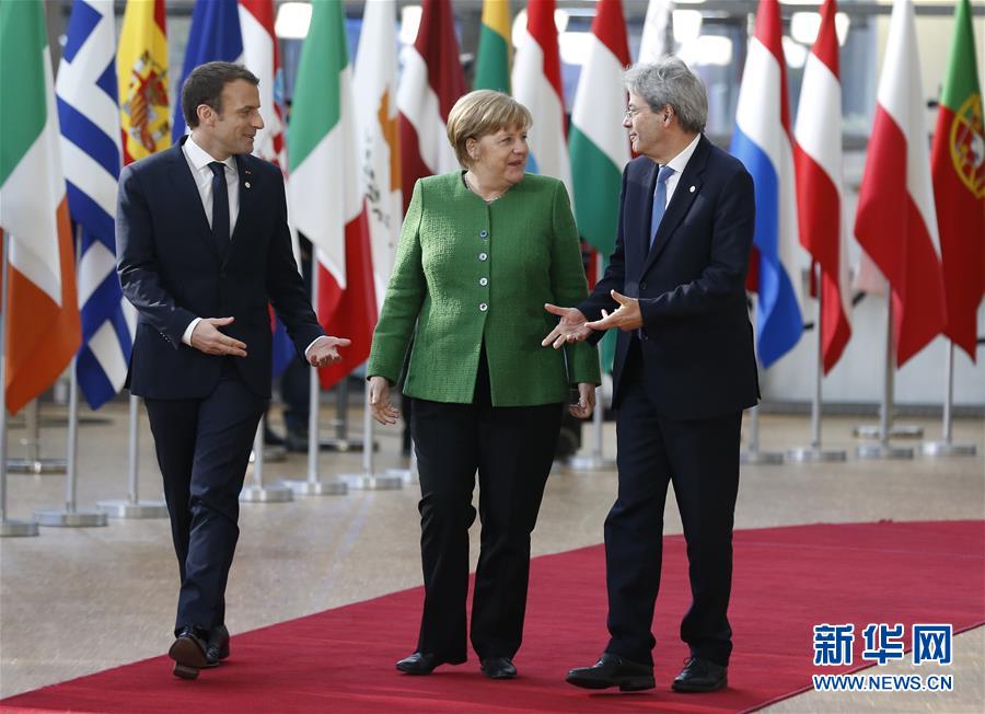 2月23日,在比利時(shí)首都布魯塞爾,法國總統馬克龍(左)、德國總理默克爾(中)和意大利總理真蒂洛尼抵達峰會(huì )會(huì )場(chǎng)。