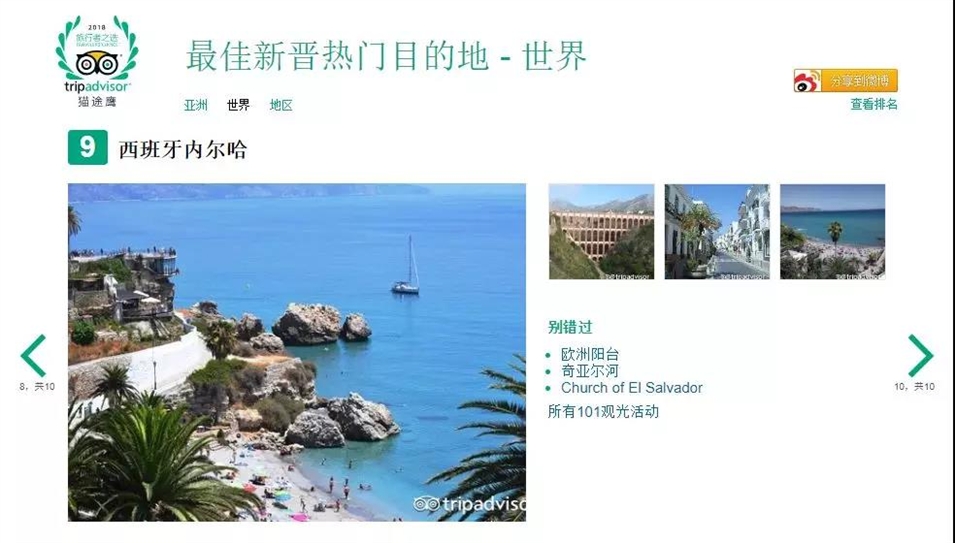 西班牙的兩座城市也分別進(jìn)入了歐洲最佳熱門(mén)目的地和世界最熱門(mén)旅游目的地榜單:內爾哈,位列歐洲第四,世界第九;加的斯,位列歐洲第八。