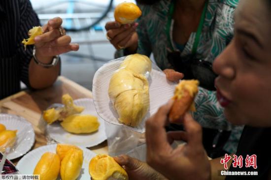展銷(xiāo)部分邀請了來(lái)自泰國50個(gè)府的農民銷(xiāo)售榴蓮、芒果、紅毛丹等熱帶水果和榴蓮比薩等制品。