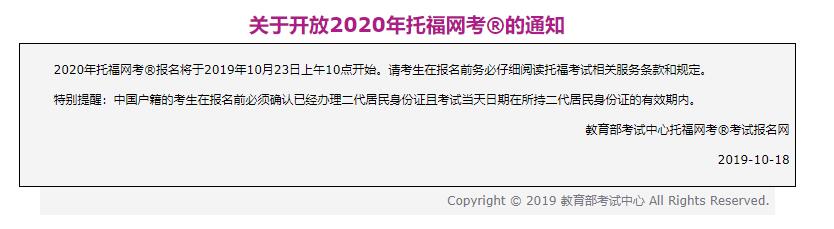 教育部考試中心托福網(wǎng)考考試報名網(wǎng)發(fā)布了通知,2020年托福報名將于2019年10月23日上午10點(diǎn)開(kāi)始。