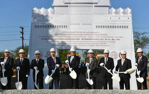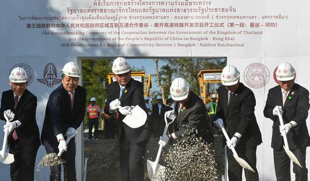 12月21日,泰國總理巴育(左三)與中泰鐵路合作聯(lián)委會(huì )中方主席、國家發(fā)改委副主任王曉濤(左二)等嘉賓們在泰國東北部呵叻府巴沖縣舉行的中泰鐵路合作項目一期工程開(kāi)工儀式上共同鏟土。當日,中泰鐵路合作項目一期工程開(kāi)工儀式在呵叻府巴沖縣舉行。李克強總理向開(kāi)工儀式發(fā)來(lái)賀信。泰國總理巴育親臨現場(chǎng)致辭。中泰鐵路合作聯(lián)委會(huì )中方主席、國家發(fā)改委副主任王曉濤、中國駐泰國大使呂健,泰國交通部長(cháng)阿空、內政部長(cháng)阿努蓬,以及來(lái)自中泰政府部門(mén)、鐵路管理部門(mén)、相關(guān)企業(yè)、媒體等近400人出席開(kāi)工儀式。新華社記者李芒茫攝