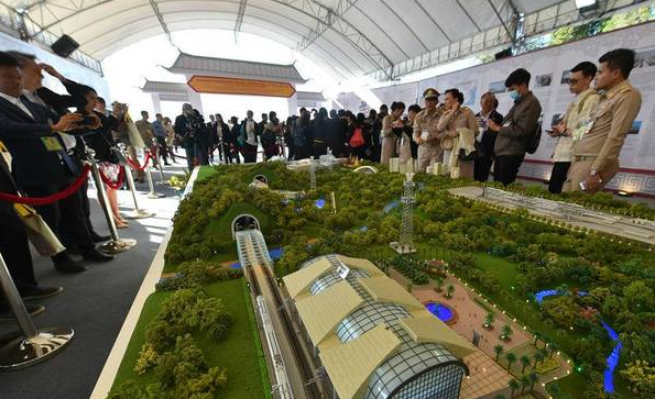 12月21日,在泰國東北部呵叻府巴沖縣,人們在中泰鐵路合作項目一期工程開(kāi)工儀式上參觀(guān)項目沙盤(pán)模型。